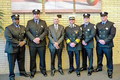 Pictured Left to Right: Probationary FF Rayquan Walker, Probationary FF David Speigel Jr., Commissioner Tony Leonetti, Chief Daniel Speigel, Probationary FF John Snyder, Probationary FF John Sharp |