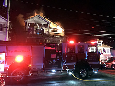 On Thursday, December 21, 2017 at 12:34 A.M. Wildwood City Firefighters responded to 620 West Maple Avenue in West Wildwood for a reported dwelling fire. Squad 3, under the command of Firefighter Gerry Vessels, North Wildwood Quint 2 and West Wildwood Fire Department were initially dispatched. The all-hands was transmitted prior to any fire departments arrival due to the calls being received. Deputy Chief Ernie Troiano arrived on-scene and reported a three-story wood frame dwelling with heavy fire on floors two and three. Chief Daniel Speigel and West Wildwood Chief Leon Woodruff arrived, assumed command and requested a second alarm.