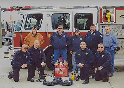 From left, standing: American Legion Members Jack Casey, Harry Tweed and Greg Mazzota, Wildwood Fire Chief Conrad Johnson, Jr., and Mike Haggerty of MES AllSafe Fire Equipment. Kneeling, from left: Firefighters Ben Ingersoll, Jim Grauel, Captain Dan Speigel, and Gerald Vessels. |
