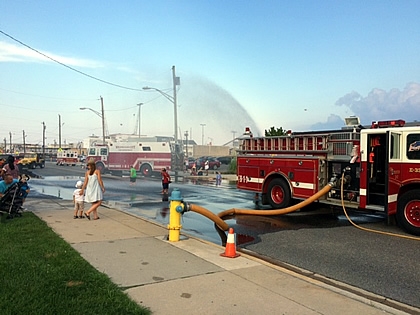 On Tuesday August 4th members of the Wildwood Fire Department participated in the Annual National Night Out event that is held at Fox Park. The WFD set up a sprinkler for the kids to play in to cool off in the high temperatures. Children attending the event also were able to use a fire hose, with the help of a firefighter, to knock down some traffic cones. In addition to the Fire Department activities there were pony rides, games, a dunk tank, police vehicles, a monster truck, and army trucks. A great time was had by all that attended. |