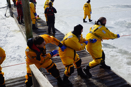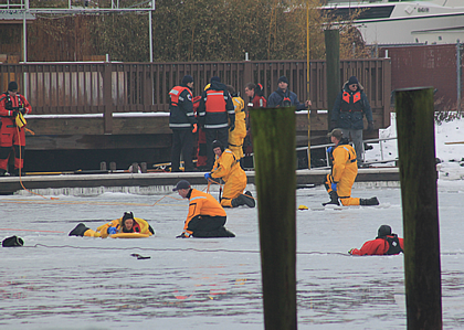 While the recent frigid weather has not been conducive to taking a dip in the icy waters surrounding Wildwood, 27 local firefighters took to the ice on Sunday February 22nd to learn surface ice rescue techniques. Under a gray sky and temperatures hovering in the mid-30s, fire personnel from Wildwood, North Wildwood, Cape May, Villas, Green Creek, Erma and Ocean City converged at the Wildwood Marina to learn the ropes of saving lives in winter conditions.