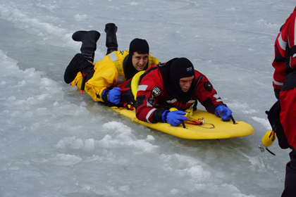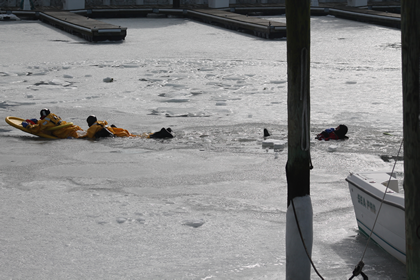 According to Deputy Fire Chief Daniel Speigel, the recent rash of cold weather was key in scheduling the training. Ice on the water of the marina was as thick as 8 inches in some areas. Chainsaws were used to cut holes on the surface to allow “victims” clad in thermal, waterproof suits to enter the 36 degree water. “The weather has been very cooperative,” he said. “As bad as it's been for everything, it's been good for this kind of situation. It allows us to do something that we haven't been able to do because the ice hasn't been this thick in recent years.” Under the watchful eyes of instructors from Safety and Survival Training, LLC, firefighters crawled across the ice to make their way to their submerged “victim.” Teams on shore tossed lifelines to the men in the water and waited as rescue personnel attached lines. Once rigged, “victims” were then pulled across the ice and onto the safety of the shore. “There are people who do venture out on the ice in this kind of weather,” Speigel said. “The Wildwood Fire Department makes sure they are trained to handle any and all situations that arise. Fire departments no longer have firefighters, they have “all hazard responders”. Funding for the Ice Rescue equipment was made in part from “Safety Incentive Funds” from the cities Joint Insurance Fund.